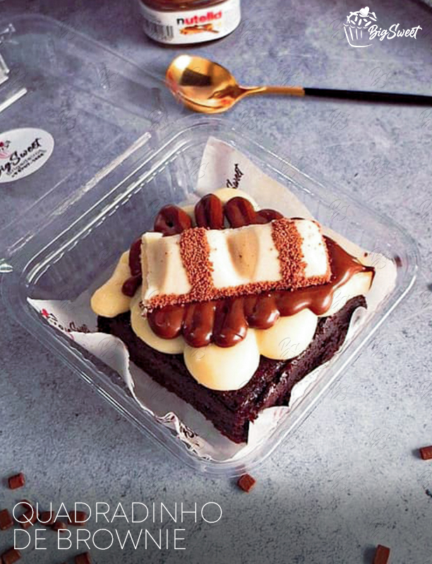 Brownie Kinder Chocolate da Big Sweet: Feito com uma deliciosa massa de brownie, recheada com creme de Ninho e brigadeiro, decorado com dois deliciosos brigadeiros de Kinder e uma barra de Kinder chocolate.